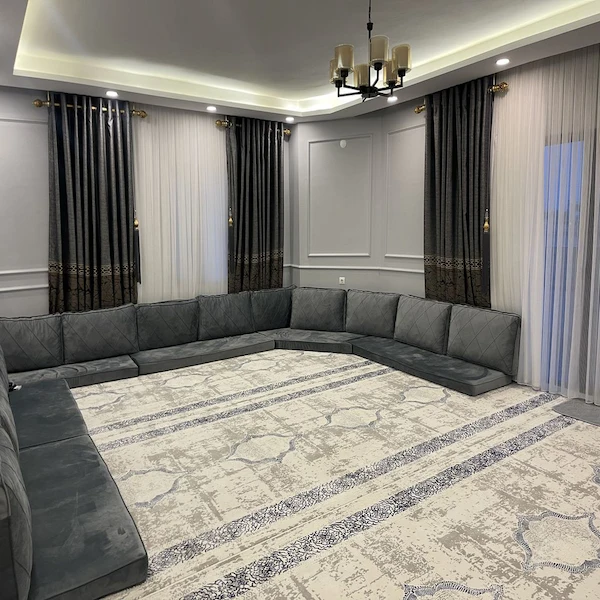 Our complete sofa set for majlis comprises a floor seating sofa bed, backrest pillows, corner cushions, and armrest pillows.